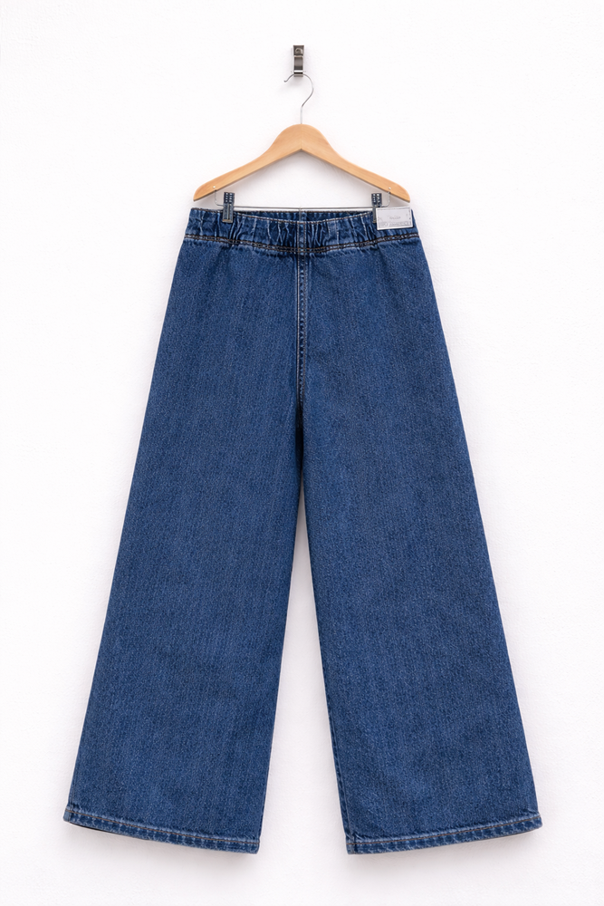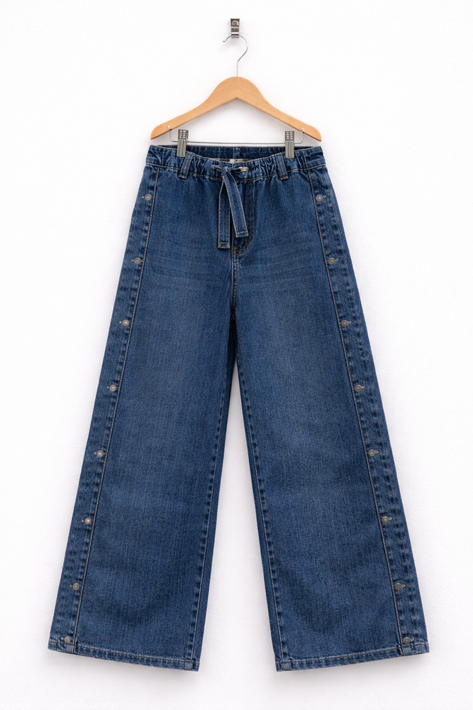 Jean teñido artesanal en prenda, elastico en cintura y arandelas termo fix en laterales. Este pantalon da un da un look único y con personalidad. Cómodo, versátil y con diseño, es una prenda clave para armar looks urbanos con estilo.
