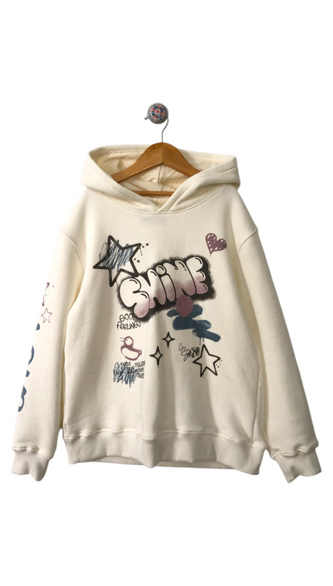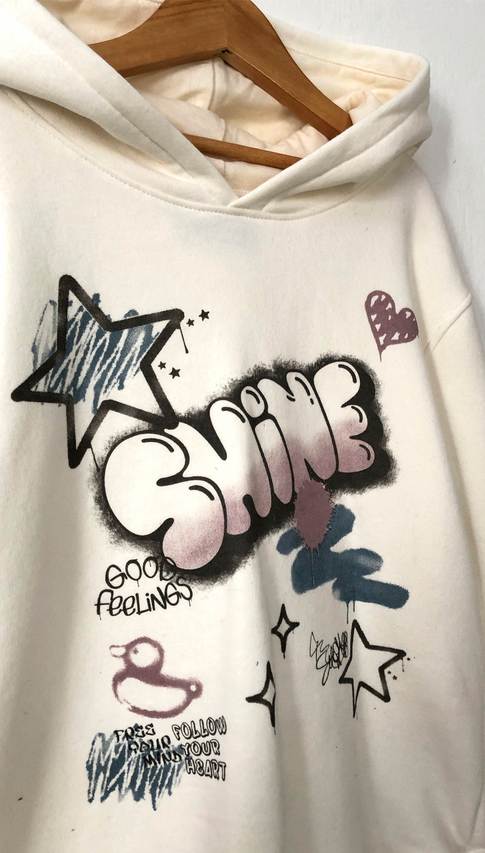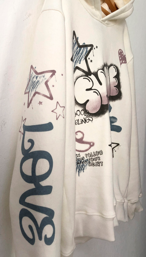Buzo de frisa con capucha forrada, estampa en frente y manga. Buzo de la linea urbana/graffitti, le agrega mucha onda a cualquier look 💜