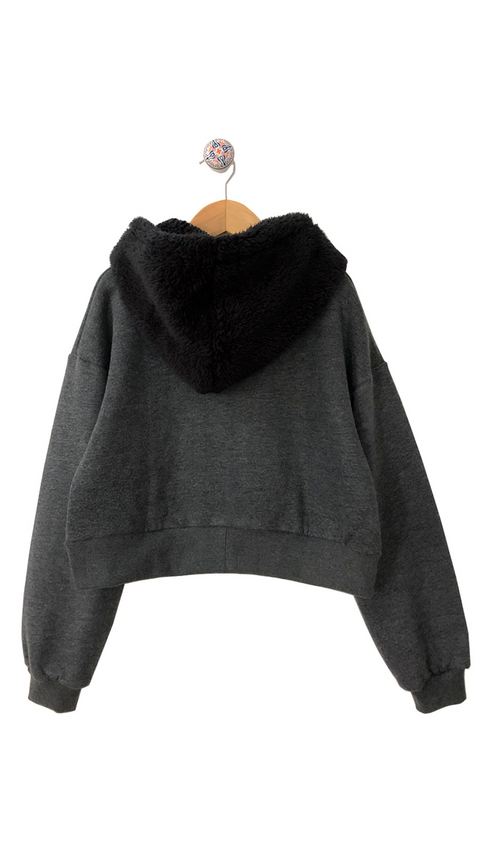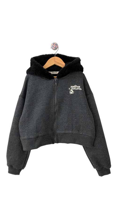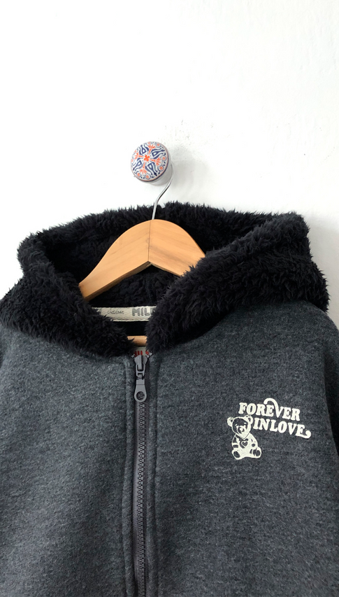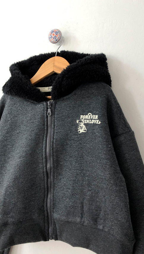 Campera de frisa con capucha de corderito bifaz y estampa en el frente. La capucha es ideal para días mas frios, es una prenda versatil para muchas ocaciones, dias de escuela, juegos o salidas
