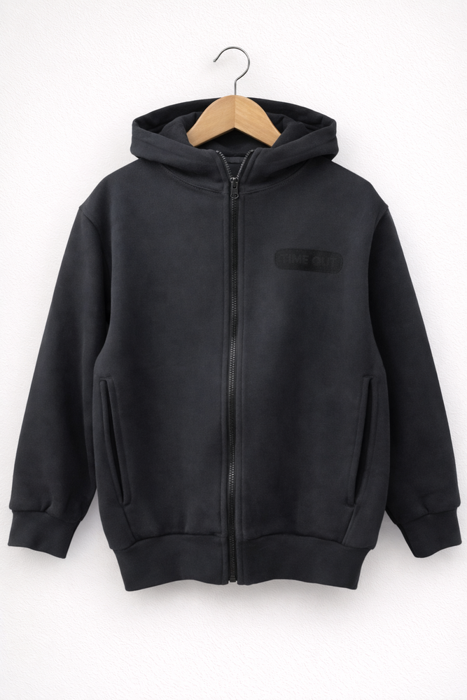 Campera de frisa con campucha, con estampa en frente y espalda