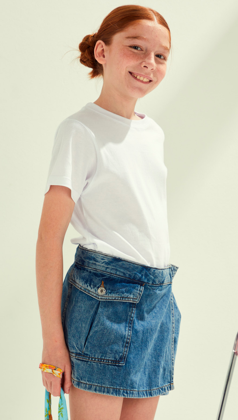 Pollera de jean con herrajes. Este modelo es una opcion para estar super comoda y chanchera este verano