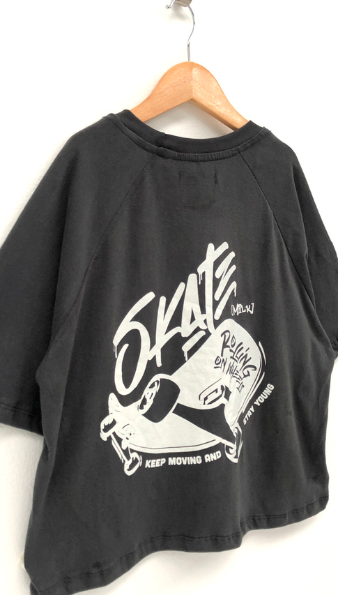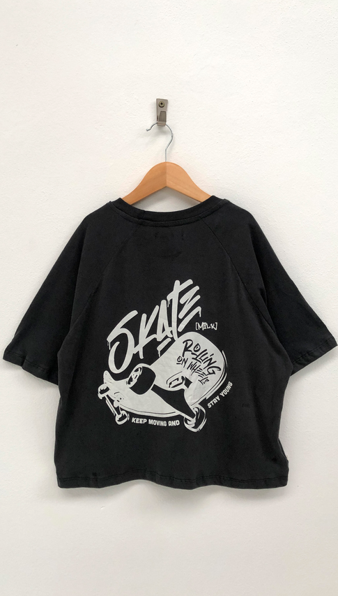 Remera de jersey con estampa skater en la espalda. Una remera de corte boxy fit ideal para looks cancheros