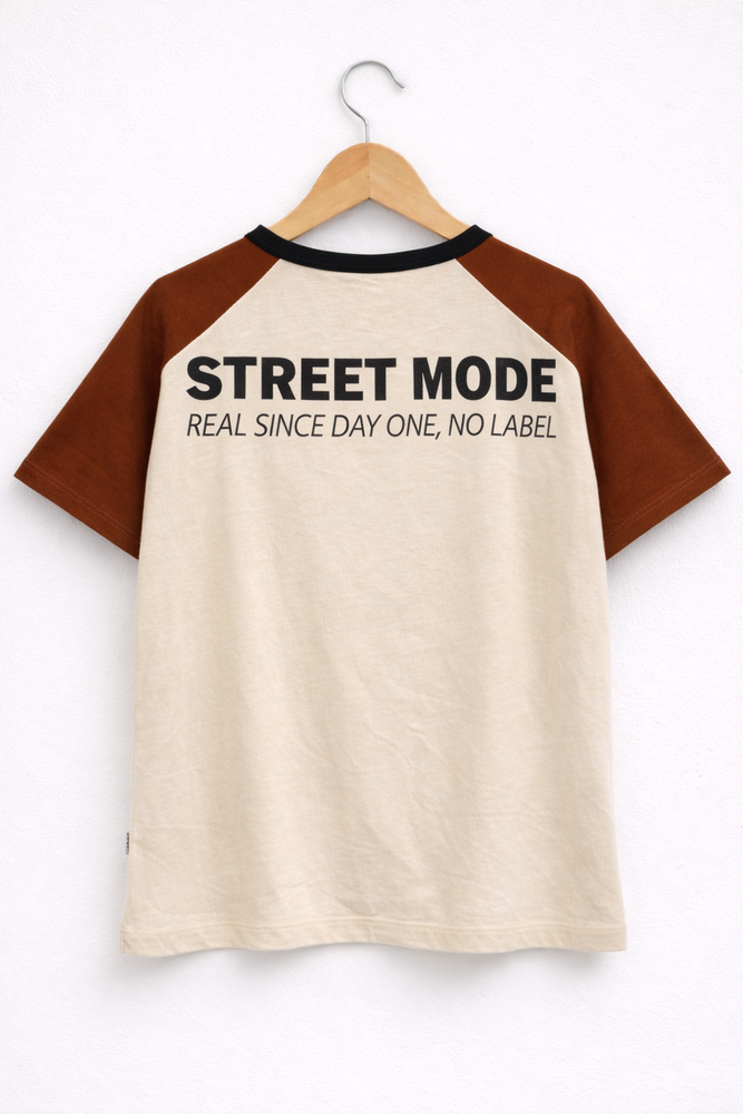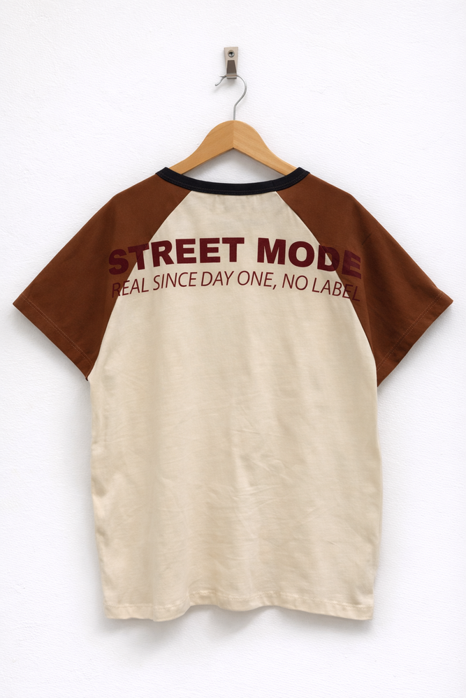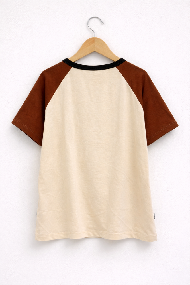 Remera manga corta de jersey de algdón con cuerpo crudo y mangas chocolate con estampa en la espalda
