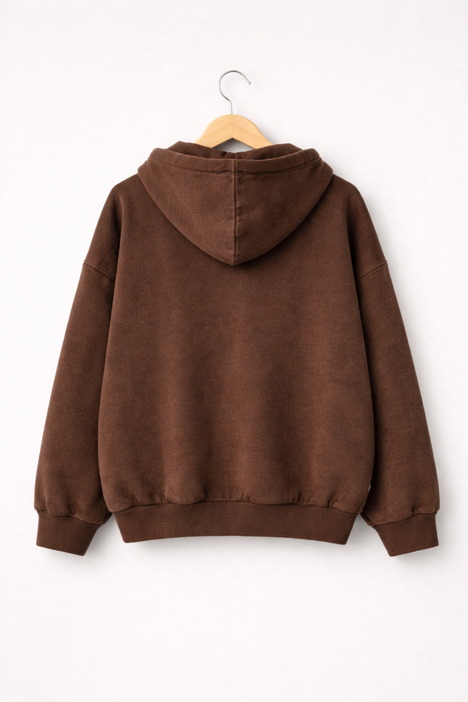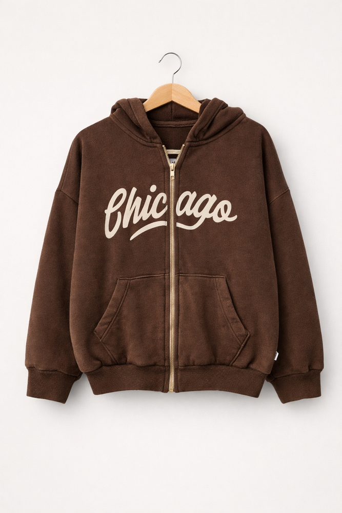 Campera de frisa con estampa en delantero, lavado nevado y roturas en puños.